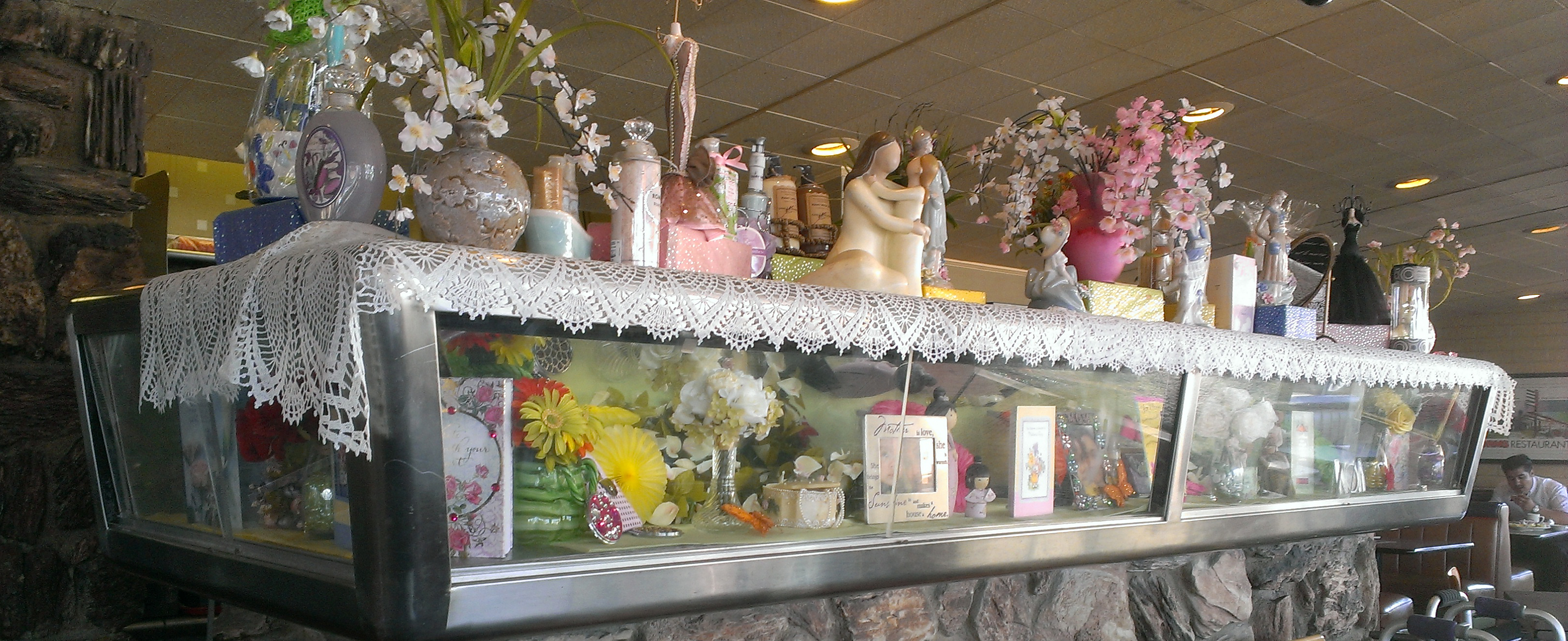 -Towards the back of the restaurant but before the restrooms, on a low stone wall, was a giant display case. It was full of and covered with dolls and flowers in vases and jeweled boxes and picture frames and many, many mother’s day cards. I asked a waitress who happened to be in the ladies’ room when I was there and she explained happily that their manager did it up for every holiday, that she had tons of holiday stuff and if it wasn’t a holiday it was full of things like cute farm animals.
