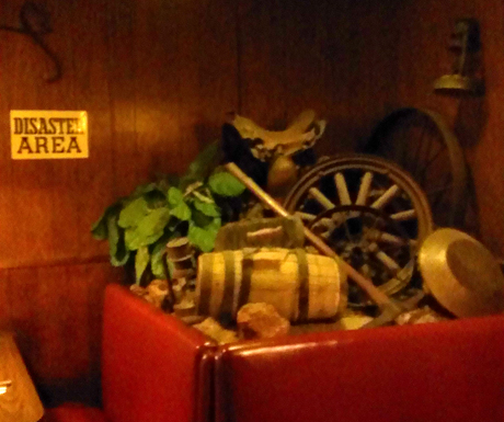 -There were some western farm tools on the walls here and there, and in one corner was a jumble of stuff: a wagon wheel, a barrel, a saddle. Next to it was a sign that said, “disaster area.”