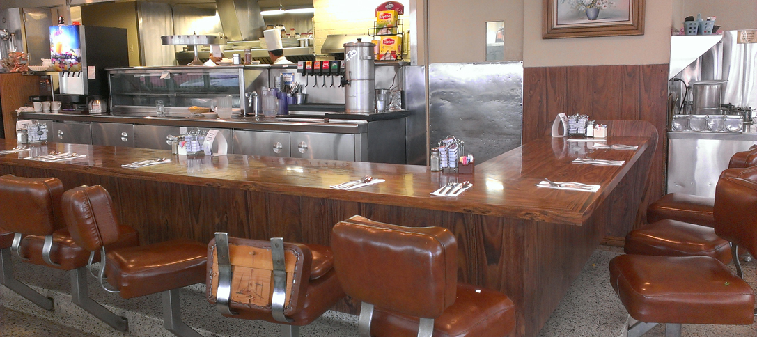 -Frank’s has the structure of a classic Googie diner, but is incredibly drab inside. It is a symphony in brown; brown seats, brown counters and tables, brown wood paneling halfway up the walls . The rest of the walls are white, the ceilings are white stucco with inset lights. There are four framed muted paintings of flowers of the type you’d expect to see in the HookerKill Motel. The only other decoration is a small cluster of pictures detailing what shows have been filmed in Franks.