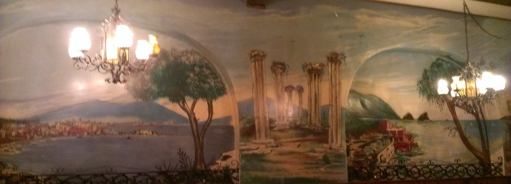 -Incredibly cozy, dim lighting and warm smells. Just inside the door is a mural on the wall showing the Italian seaside, and a curtained booth for the cashier with lots of foreign money taped up all over the walls. Dark wood and red chairs and tables, wallpaper with a lovely pattern of vines, the place is decorated to seem like you’re outside on a veranda, sitting under porches, the rafters of which are hung with white christmas lights and grape vines heavy with bunches of grapes. David (my husband) pointed out that walking in felt a little like entering a Disneyland ride, and he was right, but in the best possible imaginable way. Something about sitting in there made me feel safe and happy and good.
