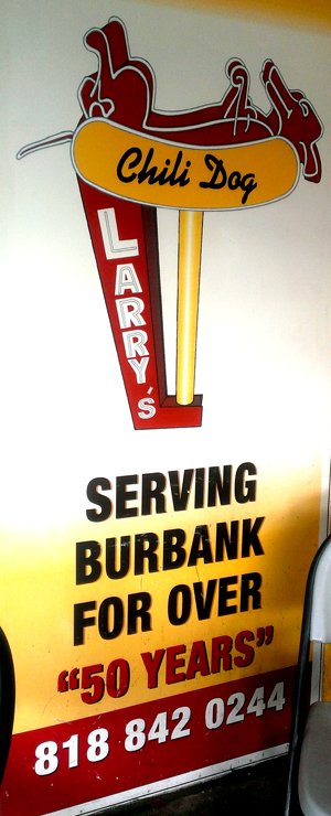 Went for a late lunch with my friend Corey at Larry’s Chili Dog. I’d often admired the chili dog sign and had always assumed it was a regular restaurant, but when I got past the row of hedges that hide it from the street I found a walk-up order window and some tables and chairs outside under an awning. It was a very hot day, but their clever placement of bushes and umbrellas made enough shade that we were quite comfortable.