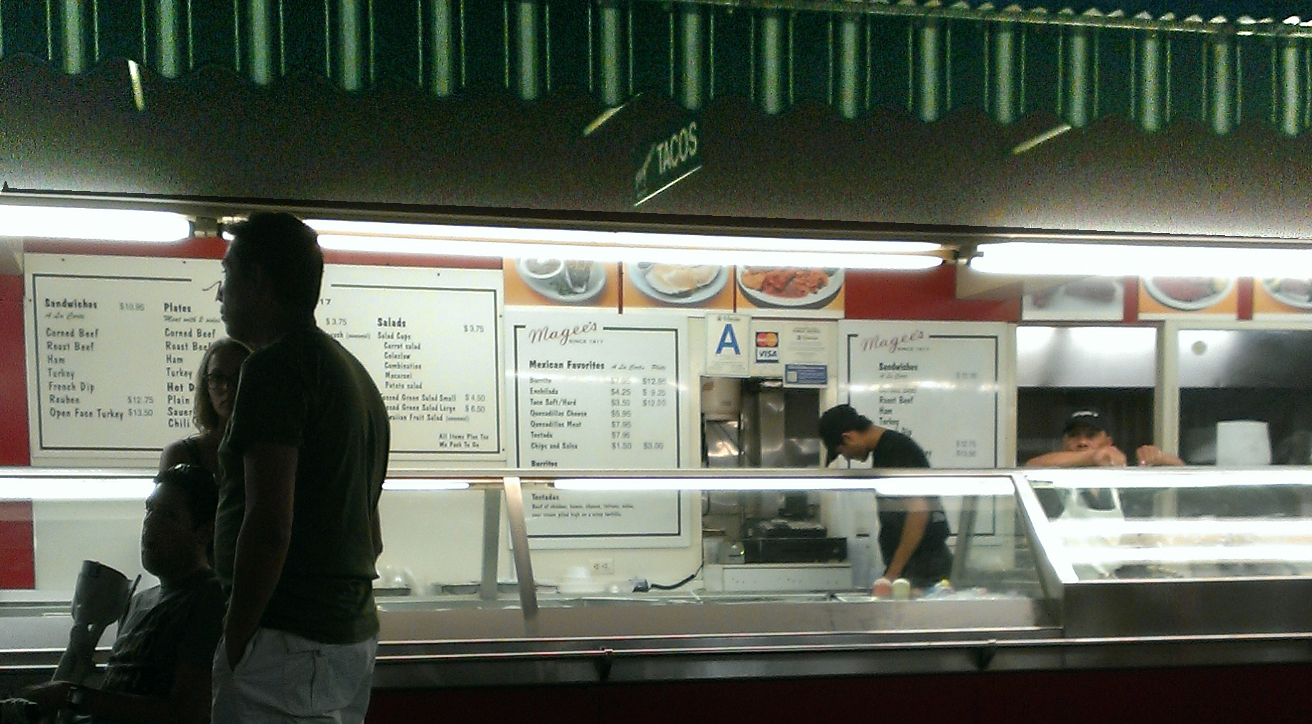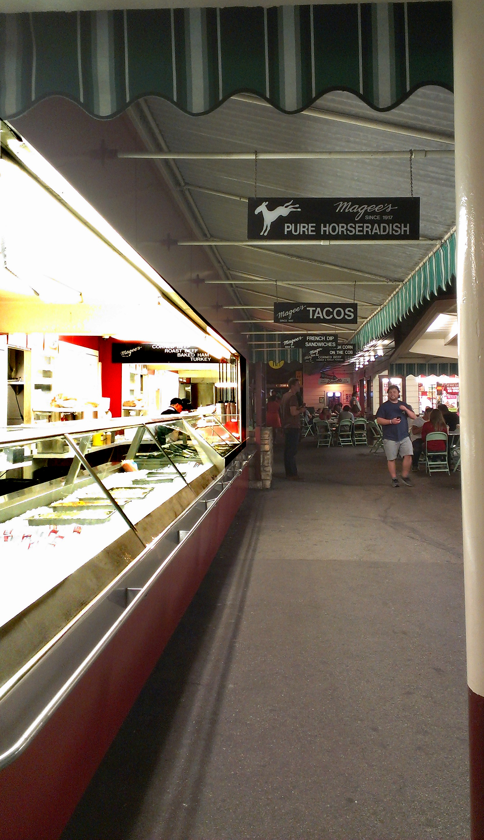 -a long counter with all the food under glass, a long line of cold salads in bowls sitting in ice, then hot sides like beans and corn and veggies in trays–all looking mouthwatering–and then a carving station with large hunks of meat. Signs advertising their offerings hang from a green striped awning overheard, the one mentioning their horseradish has a silhouette of a mule on it, and a nearby sign promises it has “a kick like a Missouri mule.” Behind the counter on the wall are photos of plates of food, and large menu placards. The signs all say that Magee’s has been around since 1917; I looked into it and learned hat they were at the Grand Central Market downtown before moving to the Farmer’s Market in ’34.