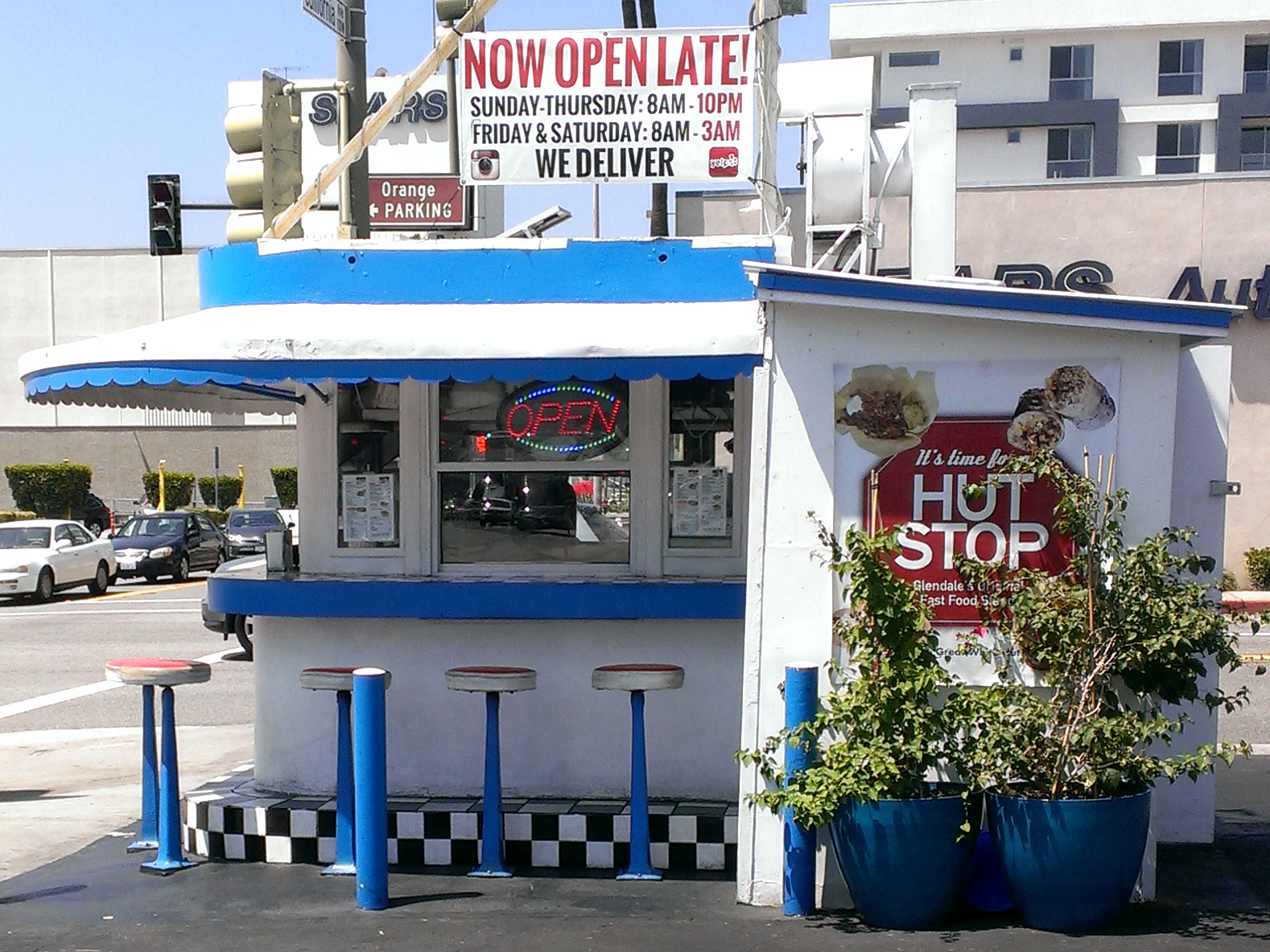 -A tiny little building in the corner of a parking lot, white walls with bright blue trim, surrounded on three sides with a black-and-white checker-board tile counter. Stools with blue posts and red seats, shaded by a blue-and-white awning. We order through a Continue reading →