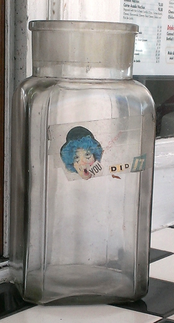 -Next to where we sat was another tip jar, this one had words taped to it–looking like they were cut out of a magazine–that said “you did it” and also a picture of a clown. The clown had make-up under it’s eyes that looked kind of like closed eyelids, so I kept thinking it’s eyes were closed and then I’d see its eyes. It was a strange effect, and got more pronounced when I pointed it out to my husband and he put his thumb over the eyes, then took it off again. It was like the clown was opening and closing its eyes.