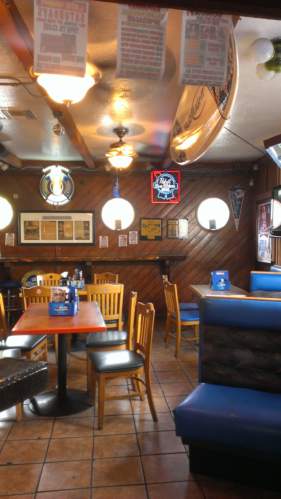 -Just inside is a counter where one can order food, a colorful menu hanging overhead and lots of flyers for sports night specials and stickers for skateboarding gear. To one side of the counter is a glassed in patio with blue stools, on the other is the room with the bar. Lots of ceiling fans, walls of slanted dark wood, blue booths and red tables and light wood chairs, a bar made of corrugated metal with tall tan wood bar stools. Lots and lots and lots of beer signs and surf boards and flyers on the walls, and multiple TVs showing multiple sports games. I sat at a table next to the bar, so I could watch the people at the bar and the people coming and going at the counter. It has a sort of fun atmosphere, like it is a place people come because they are in a good mood and want to be around people who are also in a good mood.