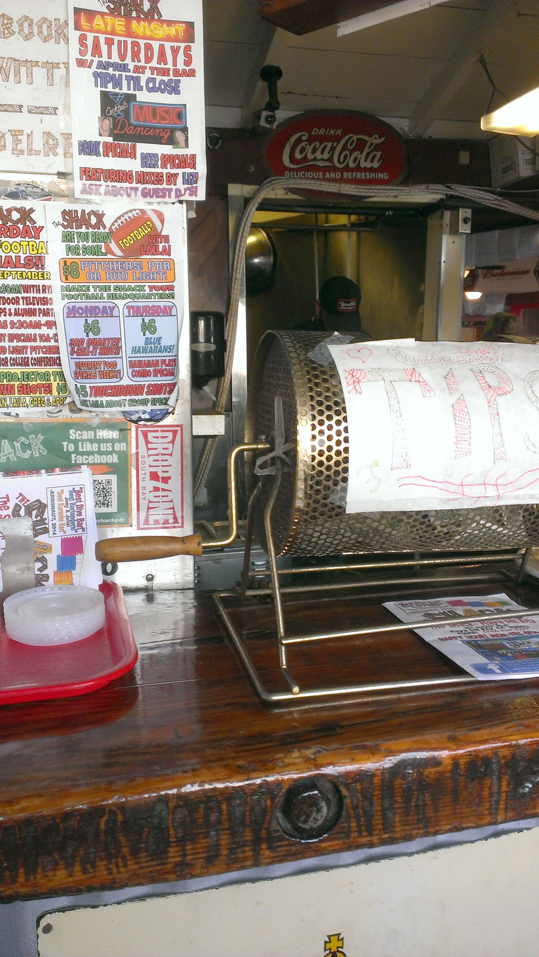 -On the counter is an extremely old long round metal cage with a handle; it’s a tip jar now but I’m pretty sure it started out as a bingo spinner.
