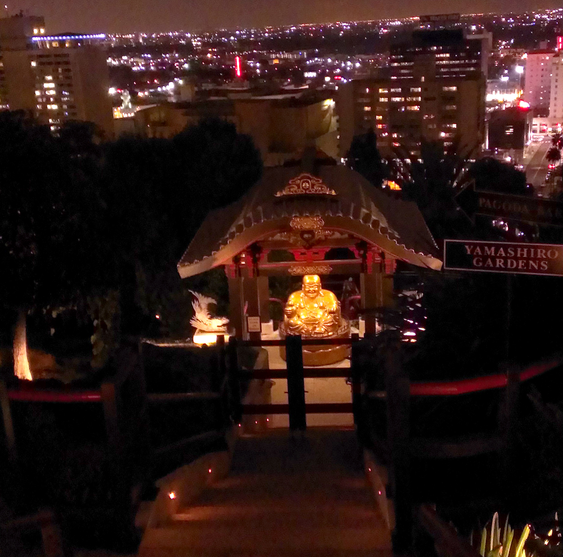 Went with David (my husband) and his mom Keren and his stepdad Jim to Yamashiro for his birthday (this was a while ago; I went back to school and have been remiss with my blogging). Yomoshiro is a shockingly beautiful Japanese-style building in the Hollywood Hills just above the Magic Castle. You drive up a sort of circular driveway and have to let the valets park your car, which I generally hate but it was fine. Below the building, across the driveway, are gardens you can walk through. Down a short path was a little pagoda with a huge statue of Buddha. It is somehow both sweetly lovely and magnificent at the same time.