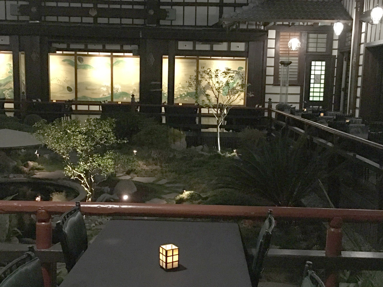-A number of connected rooms—a lobby, a bar, various eating areas—with painted panels, wood floors, paper lanterns, shoji screens on the ceiling, intricate chandeliers, all sorts of amazing woodwork and tiny details, all sort of a hodgepodge that came together in a wonderful way; what Keren called “very traditional Hollywood-Japanese.” There’s a stunning indoor garden and pond lined with tables, where we definitely would have wanted to eat if it weren’t for the patio. The patio is made of wood and windows; the walls are almost entirely windows looking out and down over all of Los Angeles. It is truly spectacular.