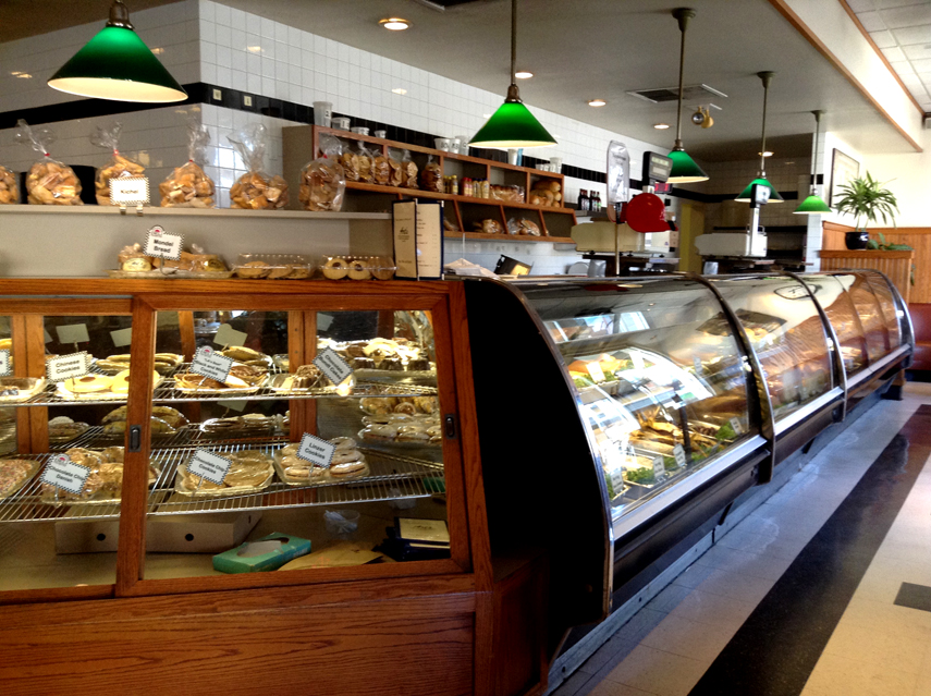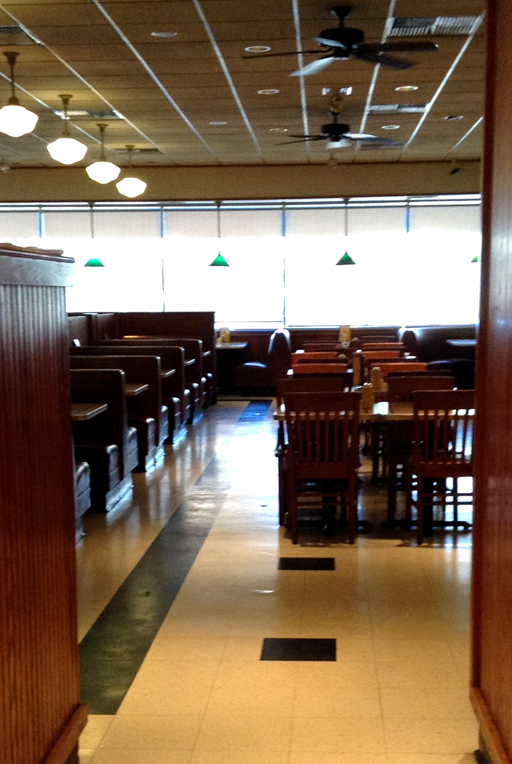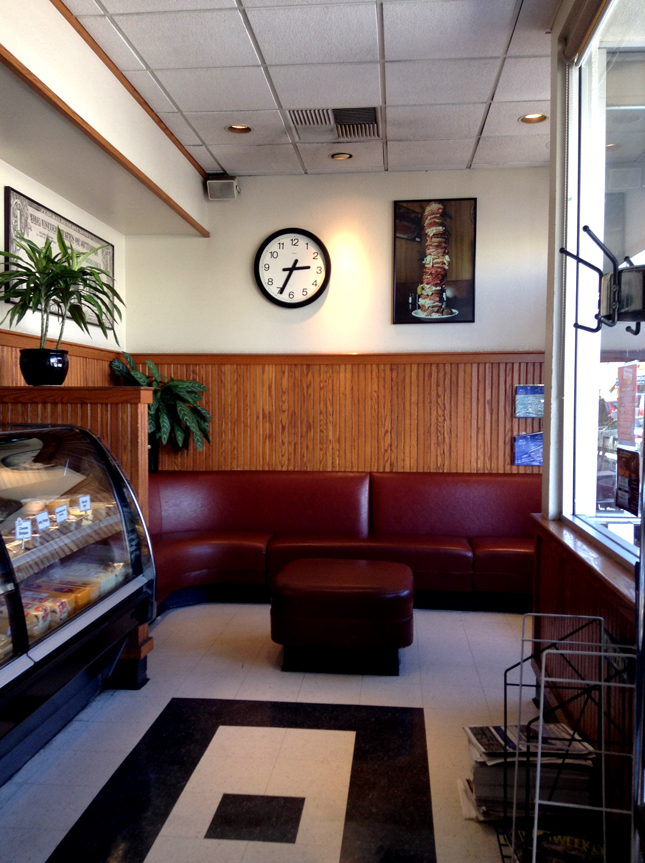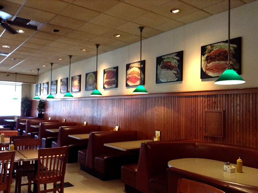 -Large, airy room, with a large deli counter in the front and, beyond, a classic coffee shop; rows of maroon and brown booths with beige tables, black and white tile floor, an acoustic-panel ceiling, hanging lamps with green shades, wood-paneled walls, a long row of giant pictures of sandwiches across the back wall, plus one picture of matzoh ball soup. Except for that one, every picture in the place seems to be of a sandwich, or sometimes a cartoon character with a sandwich.