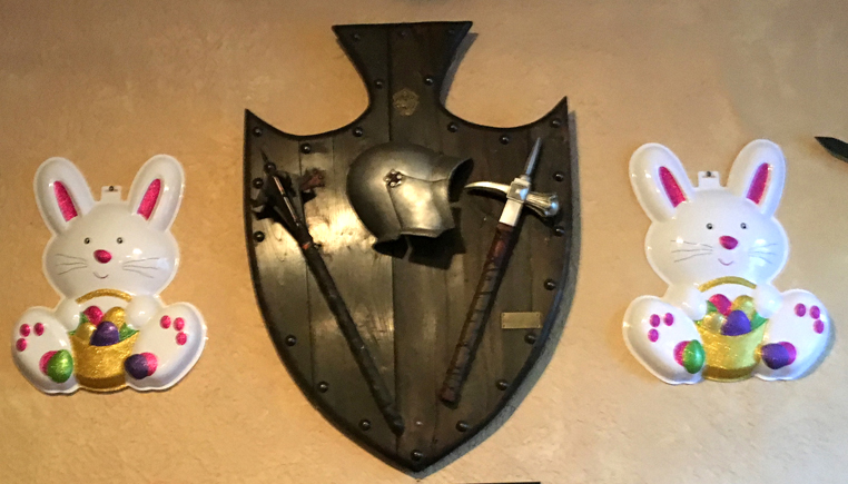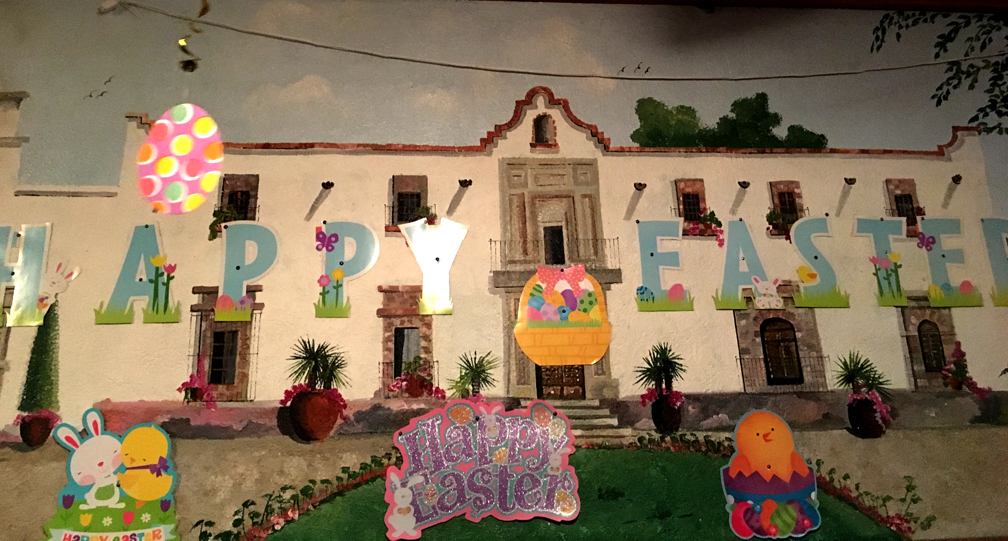 -Incredibly busy and bright, full of paintings and flowers and, above the cash register, a huge parrot hanging from the ceiling. Easter decorations (this was two days before Easter) were everywhere; bunnies and eggs and all sorts of things, but even aside from the seasonal stuff, it was a blast of color. There was what appeared to be a large wood recreation of the Mayan calendar, and ornate gold mirrors, and murals and plates and giant butterflies and fancy hanging lamps. Best of all was a fake house exterior hiding the kitchen; with fake brick under fake stucco and fake curtains inside the fake windows. I don’t know if I could have loved the place more. It would have been wonderful even without the Easter decorations hanging off everything, but the bizarre incongruity made it intensely marvelous.
