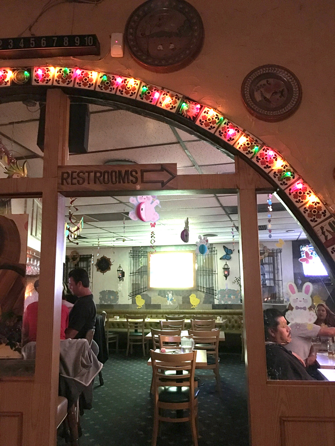 -Lots and lots of people came in while we were eating, in twos and threes mostly. I couldn’t figure out where they were sitting, as the place looked quite small from our booth. But when I got up to use the ladies’ room, I saw an arched doorway, through which was another room with a bar and TVs. The arch was particularly lovely, with colored lights over colorful tiles.