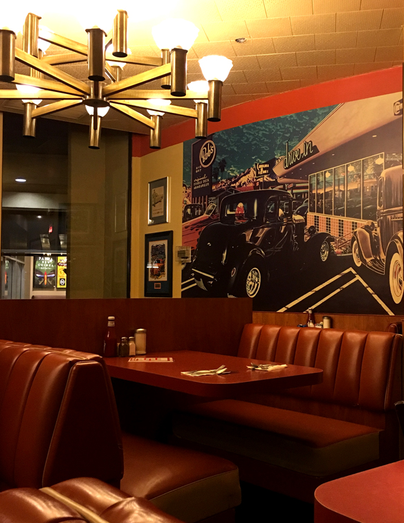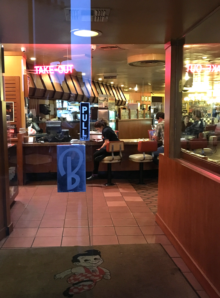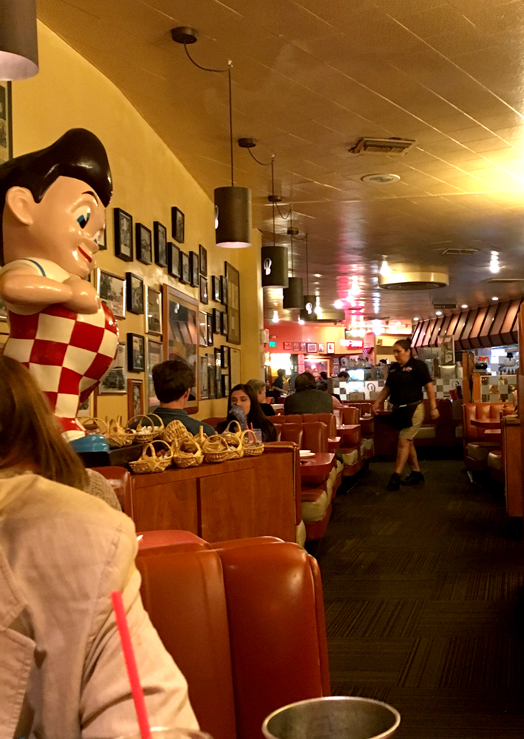 -Curvy walls with tall windows, Googie-style, a neon “Take-Out” sign just inside, pictures of classic cars everywhere, a large “Bob” statue inside, almost as big as the one outside, hanging lamps like long cans with a fancy letter “B” stamped out, framed pictures of old-time movie stars, lots of newspaper articles on the walls about Bob’s Restaurant news through the ages, neat chandeliers that look kind of like wagon wheels, if wagon wheels were metal and sort of art deco. There’s a long counter with red and white stools near the front, and many, many orange booths.