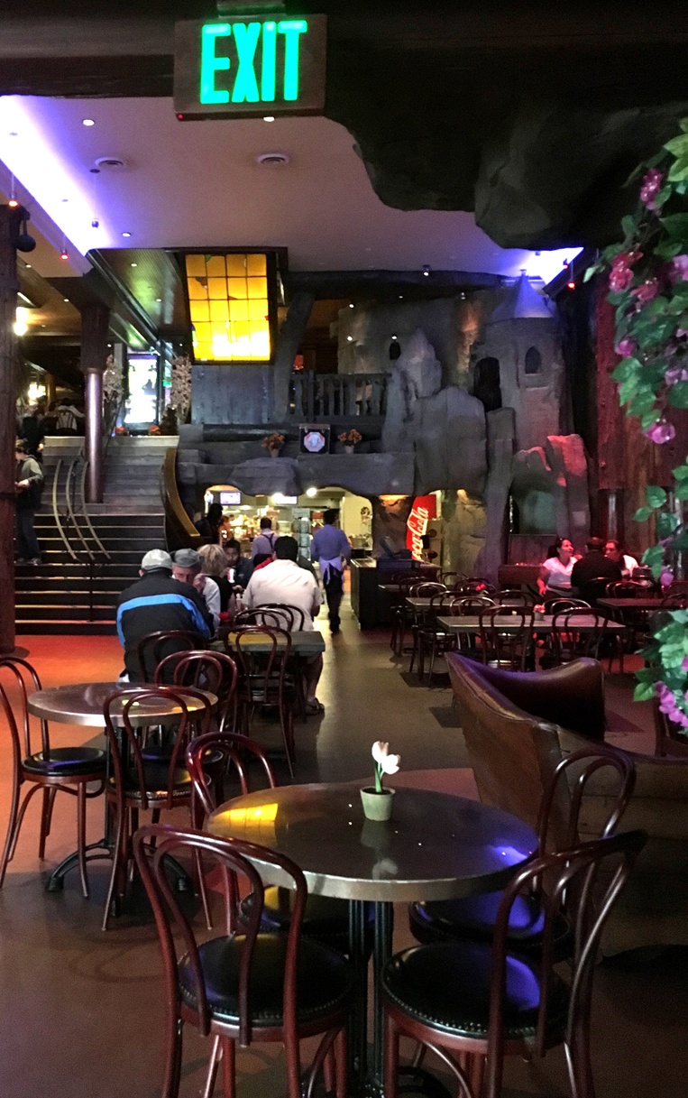 sYCCfirstfloorcliftons190-The first floor has a large eating area, lots of long tables and chairs, with rock walls, pillars like tree trunks, rock archways and a big rock fireplace, a meandering waterfall coming down from the second floor, and forest murals on the walls that aren’t rock. Also lots of flowers. In one corner, almost at the level of the second floor, is what looks like a castle tower carved out of the rock. It is immense and amazing. The cafeteria, which you get to by walking through a gift shop section full of mugs and books and old postcards, is behind the first floor eating area. It’s like a combination of a school cafeteria and a Vegas buffet, with salads and sushi and pizza and meats.