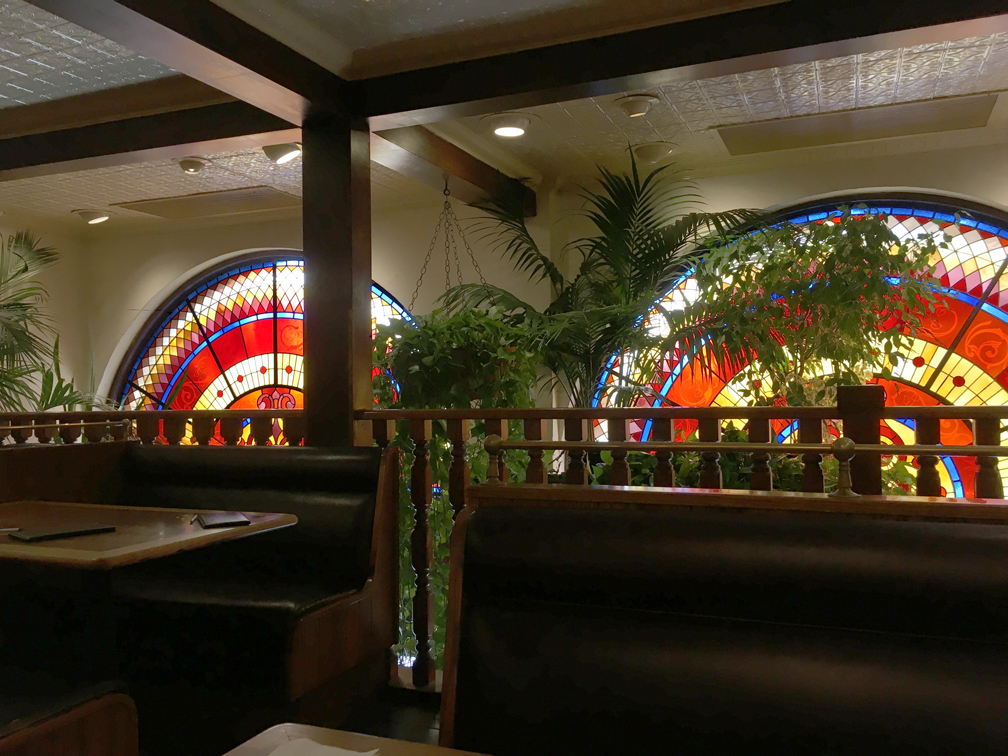 ywindowGreenblatts003-The first floor is the deli and wine shop, with some booths, but mostly the deli counter and lots and lots of wine bottles. There’s more seating upstairs so I went there. Big, heavy wood beams, solid wood stairs and floors, a terrific white tile ceiling with broad beams, brown booths that match the wood in a very pleasing way, and two huge, oval stained glass windows that are a perfect colorful counterpoint to all the dark brown wood. I sat facing the windows because it made me happy to look at them. There are lots of plants in front of the windows too. On the walls are black-and-white photos of Continue reading