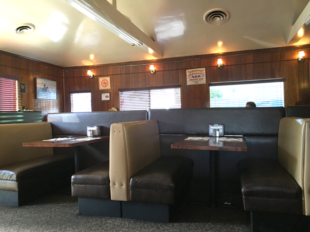 -A few rows of brown and beige booths, with a small room off to the side with another row of booths. Grey carpet and wood walls, some paintings of forest scenes and cowboys on the walls but mostly the walls were covered with awards and certificates and magazine articles stating that they have extremely good food–the words “best” and “favorite” were heavily featured. At the front of the restaurant is a big crystal chandelier. It doesn’t seem to fit with the rest of the decor and I tried to imagine how it got there. A wedding present, maybe. There is a nice patio outside, with concrete furniture that had an odd sort of Flintstones vibe.