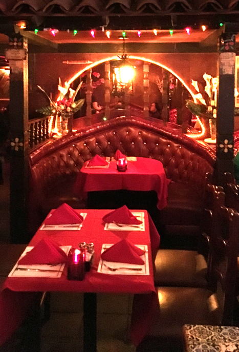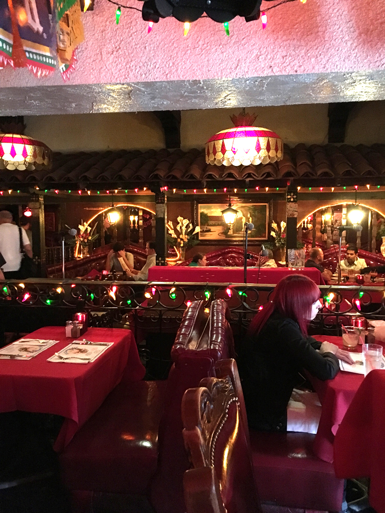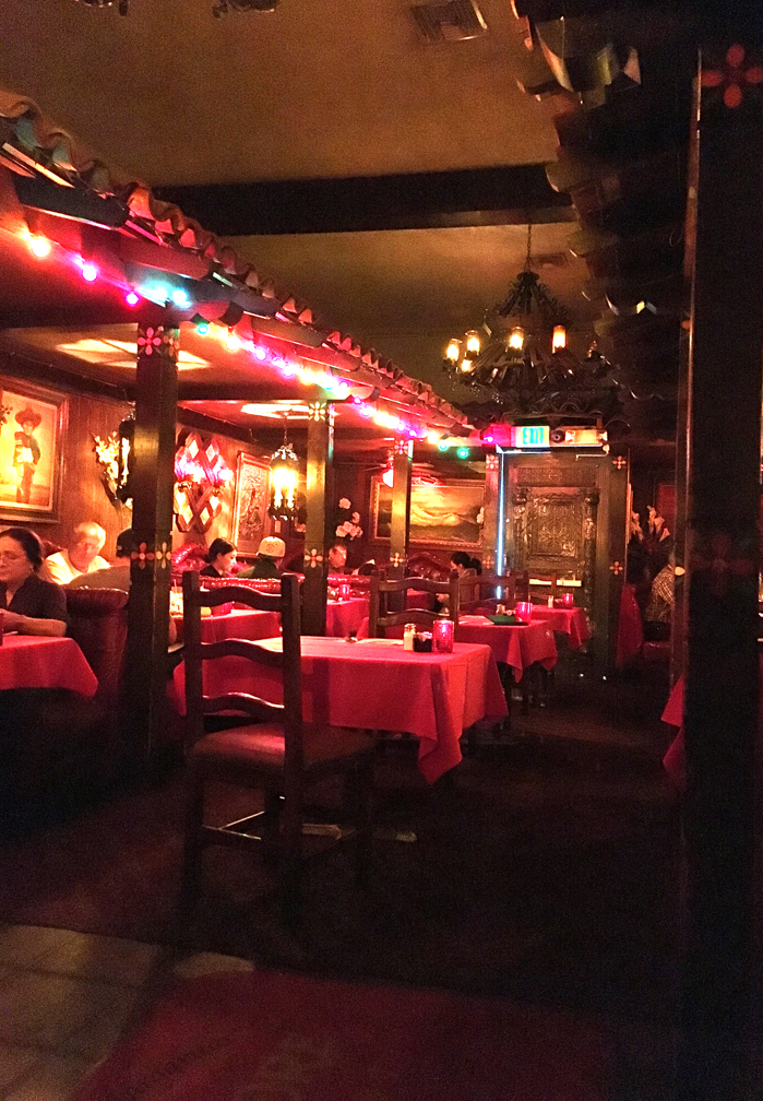 -Lots of xmas lights, some shaped like peppers, dim lighting from large round red and yellow hanging lamps, tables with red tablecloths, lots of dark wood, maroon booths with brass tacks, some of them rectangular and some round and cozy, oil paintings of street scenes and flowers, tall vases of lilies, a bar with Corona banners and sombreros hanging on the wall, mirrors in ornate oval frames.