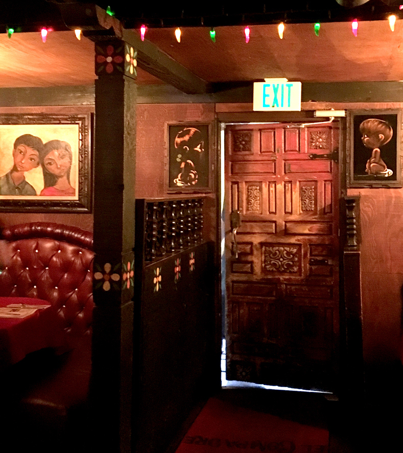 -On either side of the patio door, which also leads to where the bathrooms are, were (possibly) velvet paintings of big-eyed children sitting on potties. I’m sure they were quite adorable and kitschy and fun, but I’m afraid I have a hard time approving of pictures of people on toilets.