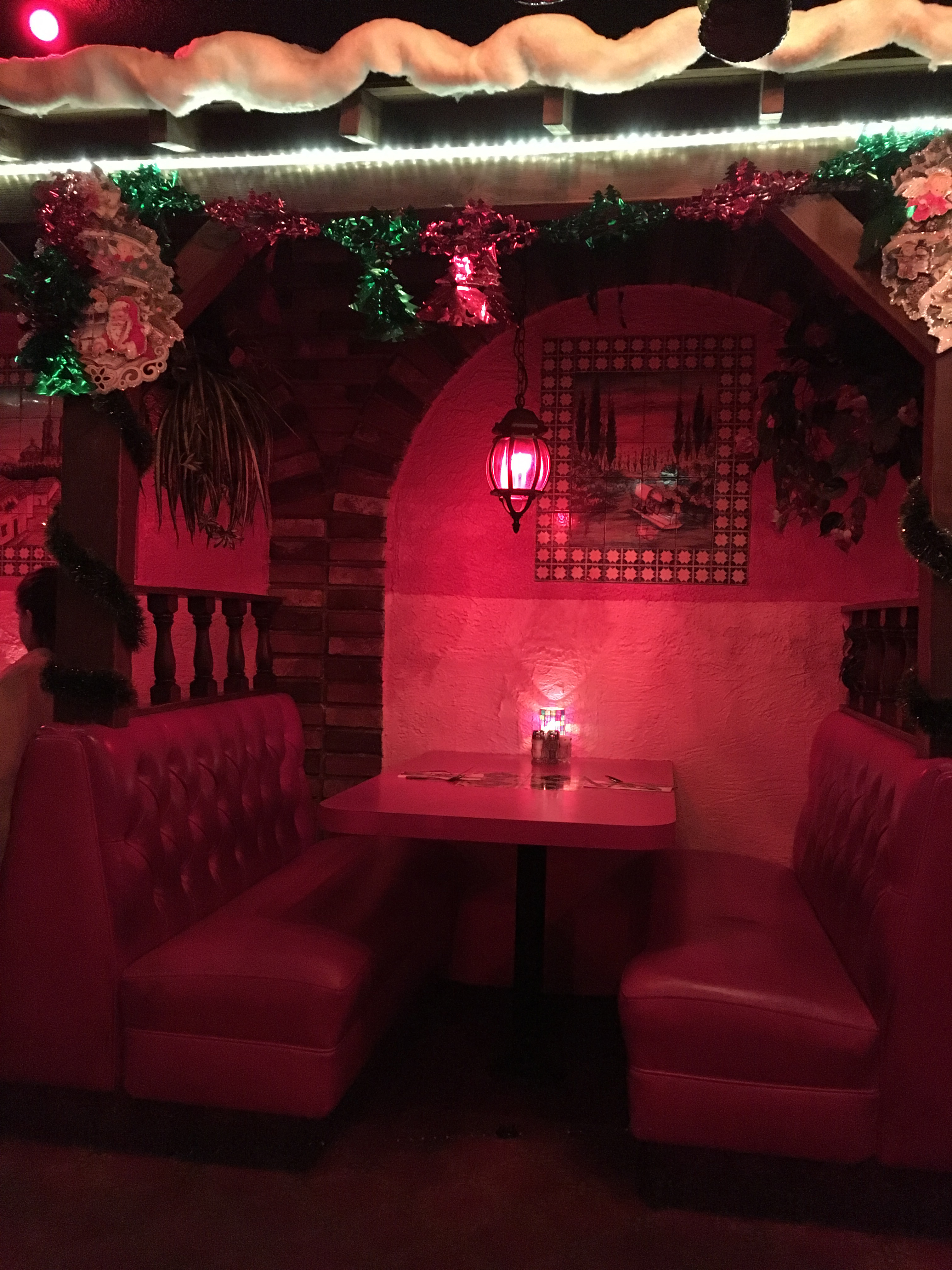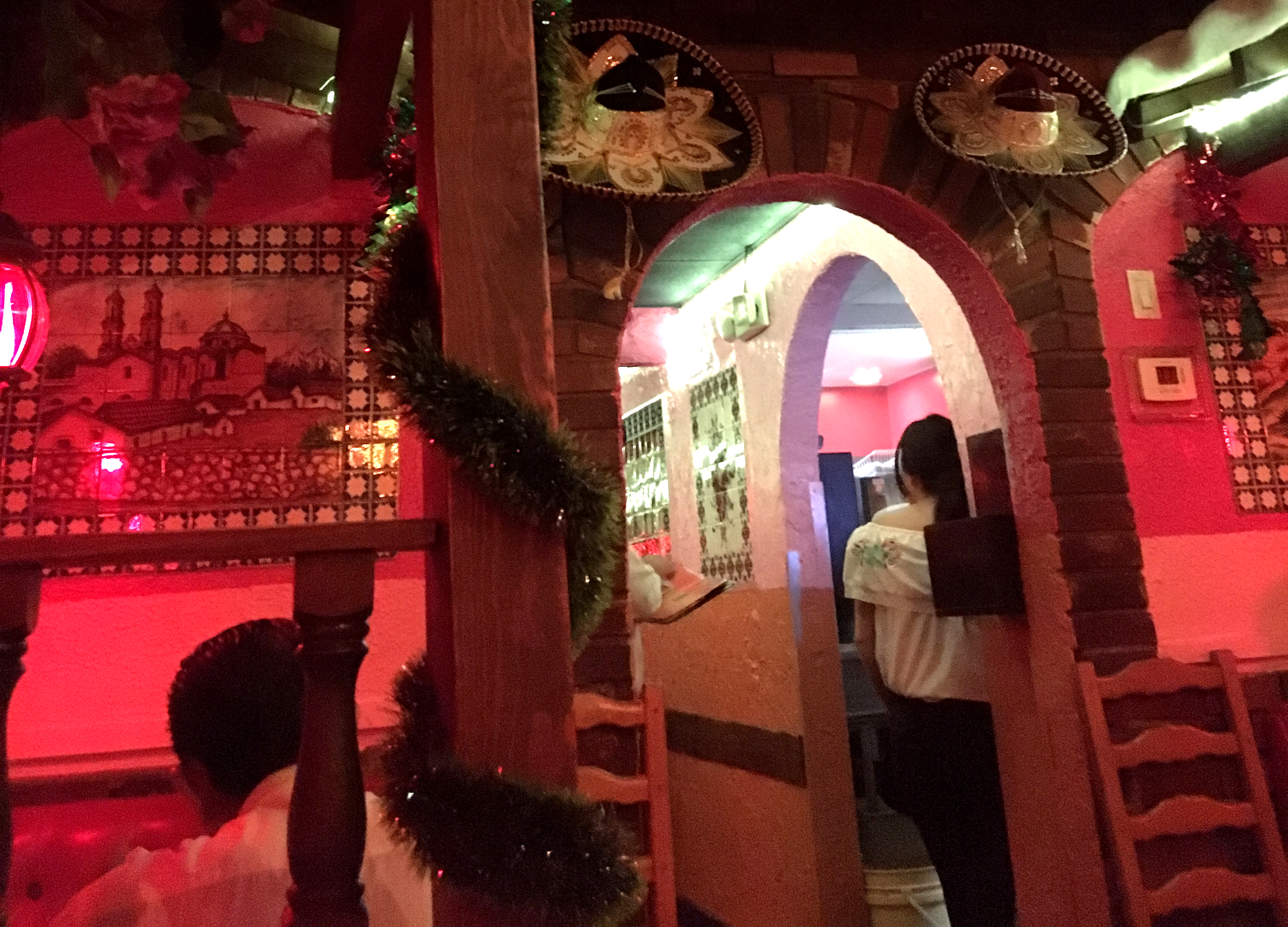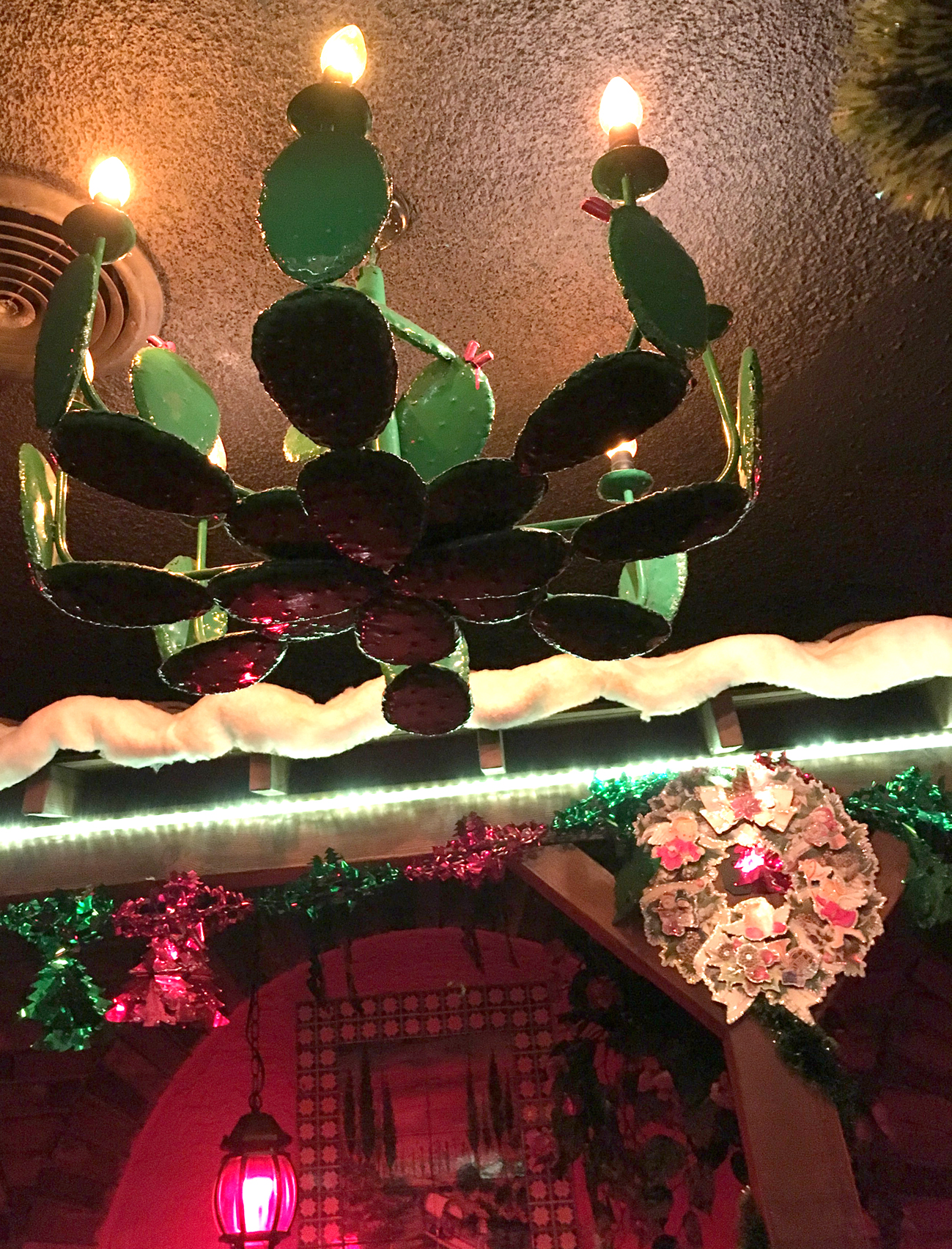 -It’s all wonderfully warm and cosy, with red lights and red booths and tables, each booth is separated from the others with wooden railings and pillars, and there’s a fake roof overhead — the kind with those rounded clay tiles — so it’s like everyone is sitting on the front porch of a house. Because we were there in late december, there were lots of Christmas decorations everywhere, tinsel and fake snow on the fake roof, blending nicely with the colorful decorations there year-round; tile pictures and sombreros hanging on the walls and the most amazing chandeliers that look like giant cacti