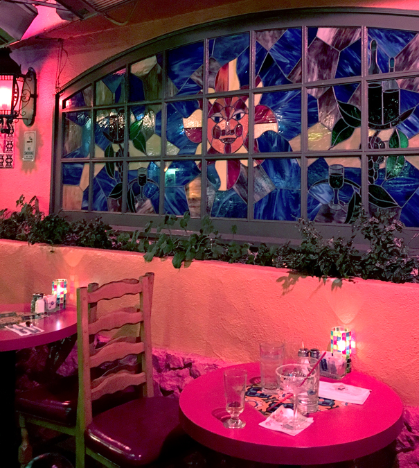 . The front room is long and narrow with booths on either side; at the end is an arched doorway and through it a second, similar room. To the right of the front room is a bar with tiled mirrors and tall stools. Each booth has a little tile picture in the wall, ours was of a hacienda with mountains behind it, and the tables have colorful tiles too. Outside, the front of the restaurant is stunning, with a huge stained-glass window with a picture of the sun and a patio with round tables and lanterns. There’s a railed-in balcony on the second floor, with more stained glass windows, but David (my husband) pointed out that there’s no actual way to get to the balcony unless you climb through a window. It’s too bad because I’d like to eat out there, but anyway it looks lovely.