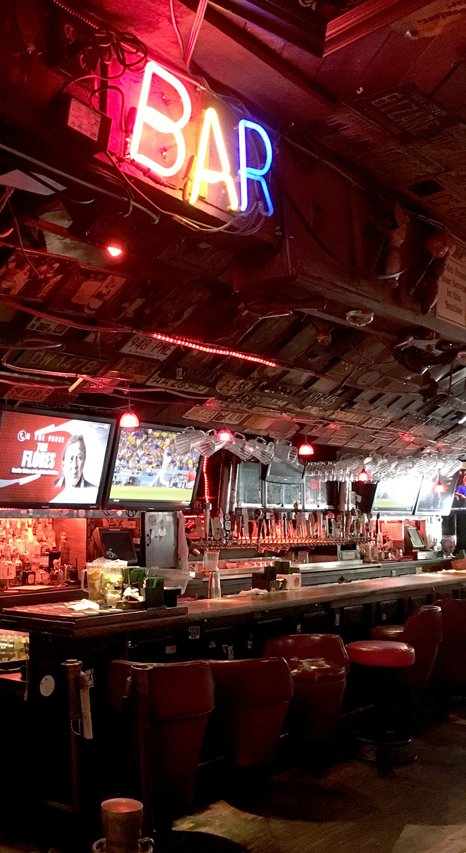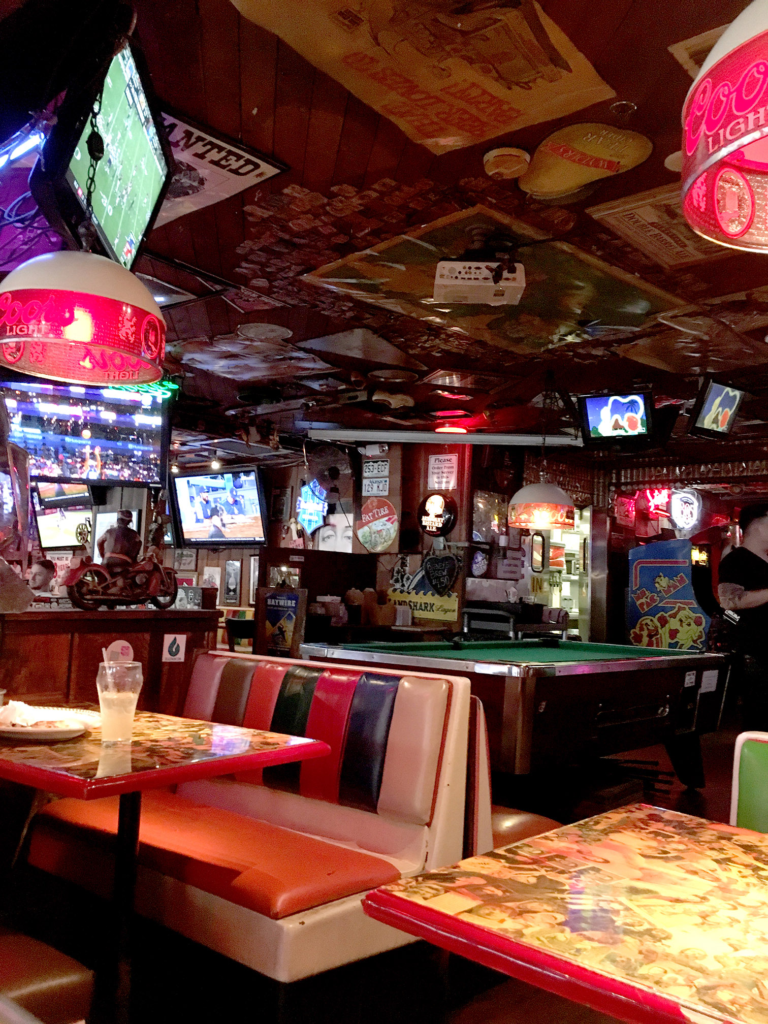 -Fantastically busy decorations, signs everywhere including on the ceiling, dozens of license plates over the bar, full-size motorcycles on the low walls separating sections, rainbow-striped booths, tables with collages of celebrity pics and newspaper clippings, something wonderful everywhere you look, lots of TVs hanging from the ceiling, hardwood floors and walls, a gaming area in the back with a Ms Pac-Man and air hockey and a basketball hoop game and some wooden game I can’t identify, and three pool tables. The atmosphere is almost indescribably marvelous, everything is jumbled and colorful and busy.