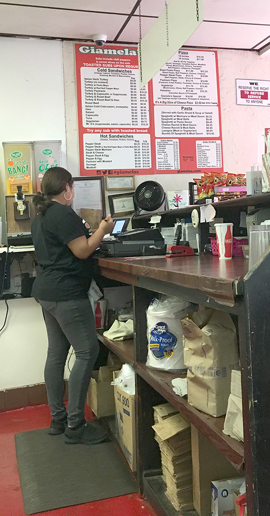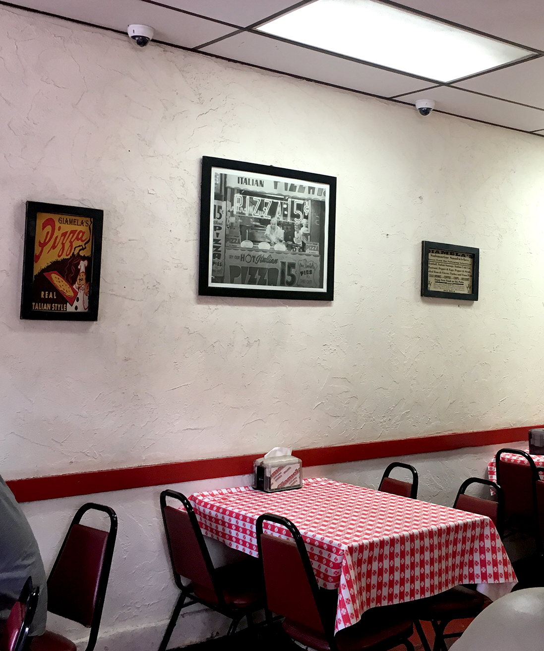 -One big room, bright and airy, with a scuffed red floor and white ceiling, and seven tables, covered in those red-and-white-checked tablecloths, with straight-backed red chairs. Most of the walls are white plaster, but the wall with the door and the one big window is red brick. Directly across from the door is the counter where you order, with racks of chips to the right and a large orange-and-white sign on the wall listing all the different types of sandwiches and pastas and pizzas and things. Hanging from the ceiling over the counter is a sign that says, “Now Serving Snake River Farms Wagyu Beef for all our Pepper Steak Subs” plus a picture of the Instagram logo, I guess to remind people to Instagram their sandwich. On the walls are framed pictures: a coca-cola sign; a large photo of the New York skyline; a couple of old Giamela’s ads; a photograph of an old-timey pizza place, probably in New York, with a guy serving pizza through a walk-up window (I liked that one a great deal); and nine framed snapshots of what seem to be Giamela’s being built and opened. On another wall are a couple old-fashioned ads for guns, one for Colt and one for Winchester. I wondered what made people choose these particular pictures. Was it done all at once, or as they were found? Did someone came running in saying “just look at these pictures of guns I got! They’ll be perfect for the walls at the restaurant!” These kind of one-room sandwich shops can go a number of different ways; some are cramped and dark and make you feel like you should just get your sandwich to go… but Giamela’s feels welcoming and nice and comfortable, the sort of place that anyone would want in their neighborhood.