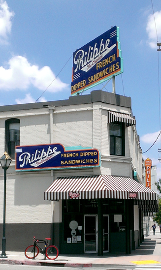 Philippe the Original, which is always just called “Philippe’s,” claims to have created the french dip sandwich. I say “claims” because Cole’s, which is also downtown and opened the same year, claims the same thing. I’m planning on going there soon. I don’t think it matters a lot who did it first, as long as they’re both delicious. David (my husband) and I got to Philippe’s around noon, wanting to see it during the lunch rush. It was bustling but not overwhelming; he says he’s seen it with lines out the door.