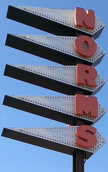 normssignAfter a surprisingly uneventful dentist appointment, I stopped by the original Norm’s for a late lunch. Norm’s has a sign that always shows up in pictures of cool L.A. signs–for good reason, it’s neat–and the building is the quintessential Googie diner.